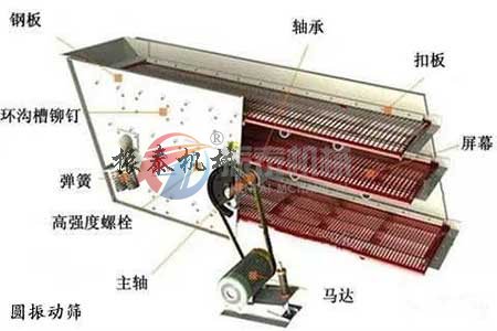 圓振動篩是利用配備的電動機通過三角皮帶帶動使激振器偏心塊產生高速旋轉,產生很大的離心慣性力,激發篩箱產生一定振幅的圓運動,篩上物料在傾斜的篩面上受到篩箱傳給的沖量而產生連續的拋擲運動,物料與篩面相遇的過程中使小于篩孔的顆粒透篩,從而實現分級。