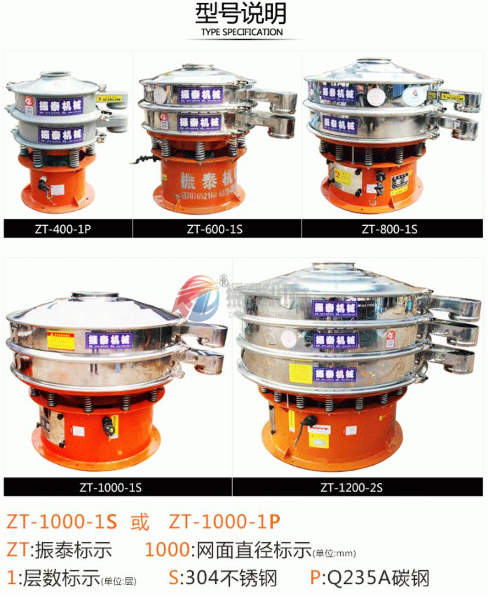振動篩廠家振泰機械型號齊全,篩機主要材質分為SUS304不銹鋼材質或普碳鋼材質兩種,大小直徑可從400至1800mm的1-5層的不同型號篩機,還可根據用戶需要設計為加緣式振動篩、閘門式振動篩、塑料振動篩、風冷式振動篩等特殊型號,更可以根據物料特性不同、環境差別、篩分目標不一、場地限制、生產線配置等條件專業為所需用戶設計生產非標產品。
