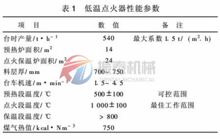 該工程在生產實踐的基礎上,考慮使用高爐煤氣作點火煤氣的特點,采用長弧形二次連續低溫點火器(見表1)。
